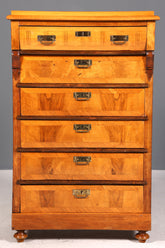 An elegant Gründerzeit-era chest of drawers in the Art Nouveau style, featuring a distinctive vertico design. This authentic chest of drawers impresses with its classic silhouette and handcrafted workmanship – a timeless piece for lovers of high-quality antique furniture. Ideal as a linen chest or for stylish storage in bedrooms and living rooms. Every detail tells the story of its era. An investment in quality and aesthetics that will last for generations.