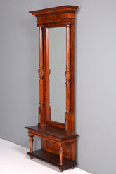 An elegant Gründerzeit console table from around 1880 with an integrated mirror – an authentic piece of hallway history. The intricately designed shelf offers practical storage for keys, letters, and decorative items, while the generously sized mirror visually expands the entryway. Handcrafted with a distinctive patina finish that preserves the timeless elegance of this era. An investment piece for vintage furniture enthusiasts, adding character and sophistication to any hallway.