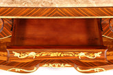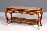 Dieser wunderschöne Konsolentisch im eleganten Barockstil begeistert durch seine feine Verarbeitung, die hochwertige Natursteinplatte und die kunstvollen Furnierarbeiten aus Edelholz. Die drei Schubladen bieten praktischen Stauraum, ohne den ästhetischen Gesamteindruck zu stören.