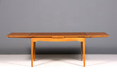 Dieser exquisite Mid-Century Esstisch verkörpert die zeitlose Eleganz des dänischen Designs. Gefertigt aus hochwertigem Teakholz mit charakteristischer Maserung, besticht das Stück durch seine klare Linienführung und funktionale Schönheit. Der ausziehbare Mechanismus ermöglicht flexible Nutzung – von intimer Mahlzeit bis zu geselligen Dinnerabenden. Die warme Honigfarbe des Teaks harmoniert mit nahezu jedem Einrichtungsstil und entwickelt mit den Jahren eine wunderbare Patina. Ein authentisches Designerstück, das Qualität, Handwerk und zeitlose Ästhetik vereint – ideal für Liebhaber von Vintage-Möbeln, die Wert auf Originalität und Langlebigkeit legen.